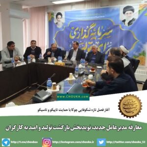 مراسم معارفه مدیرعامل جدید شرکت چوکا با حضور مدیران ارشد هلدینگ‌های تاپیکو، مدیرعامل تاسیکو، اعضای هیئت‌مدیره، معاونین، مدیران، اعضای شورای اسلامی کار در فضایی آکنده از همدلی، امید و نگاه رو به آینده برگزار شد.