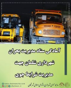آمادگی کامل نیروها، ماشین آلات و خودروهای سنگین و سبک ستاد مدیریت بحران شهرداری شلمان در پی هشدارهای سازمان هواشناسی و سازمان مدیریت بحران کشور جهت مدیریت شرایط جوی