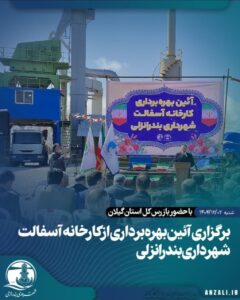به گزارش همای خبر به نقل از اداره ارتباطات و امور بین الملل شهرداری بندرانزلی، صبح اسفند ماه ، آیین بهرهبرداری از کارخانه آسفالت این شهر با حضور دکتر احمد آقایی بازرس کل استان گیلان، دکتر صادق صادقپور شهردار بندرانزلی، شعبان جعفری رئیس شورای اسلامی شهر و جمعی از اعضای شورا، مدیران شهری و استانی برگزار شد و این مجموعه پس از نزدیک به دو سال تعطیلی فعالیت مجدد خود را آغاز کرد.
