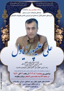 به مناسبت چهلمین روز درگذشت علی علیپور نیاول، امروز پنجشنبه یکم آبانماه، در مسجد آقا سید محمد یمنی لاهیجان گرد هم میآییم تا یاد و خاطره این چهره ماندگار عرصه فرهنگ و رسانه را گرامی بداریم.